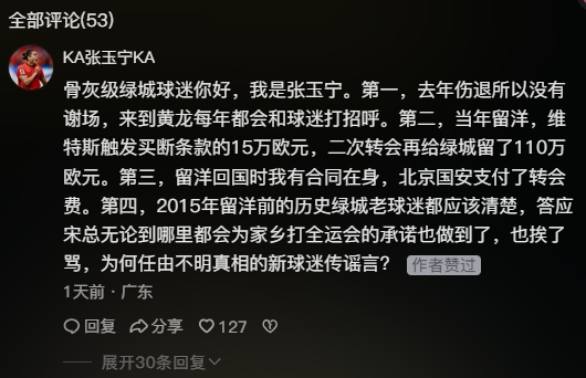 直播吧04月21日讯 中超第6轮联赛北京国安客战浙江,张玉宁面对老东家作战,赛后张玉宁向浙江球迷进行谢场致意。面对部分浙江球迷的批评声,张玉宁抖音账号(经过官方加V认证)在一位浙江博主的评论区进行了澄清。