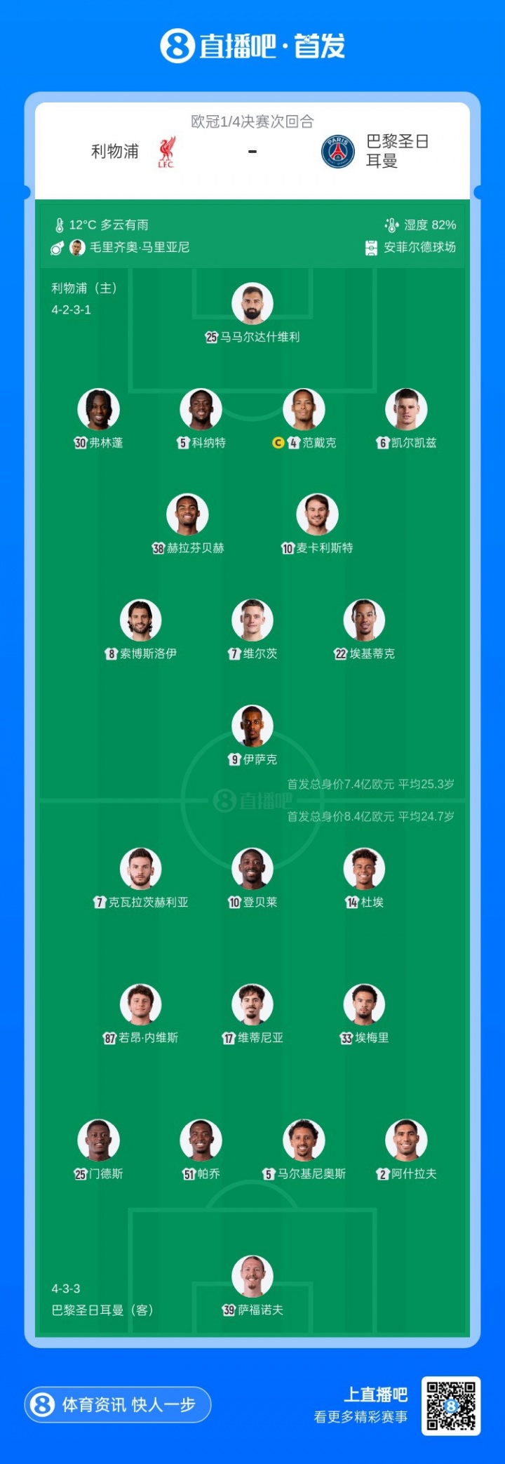 直播吧4月15日讯 欧冠8强次回合,利物浦主场迎战巴黎比赛即将打响。赛前首发出炉。首回合比赛,巴黎2-0利物浦。